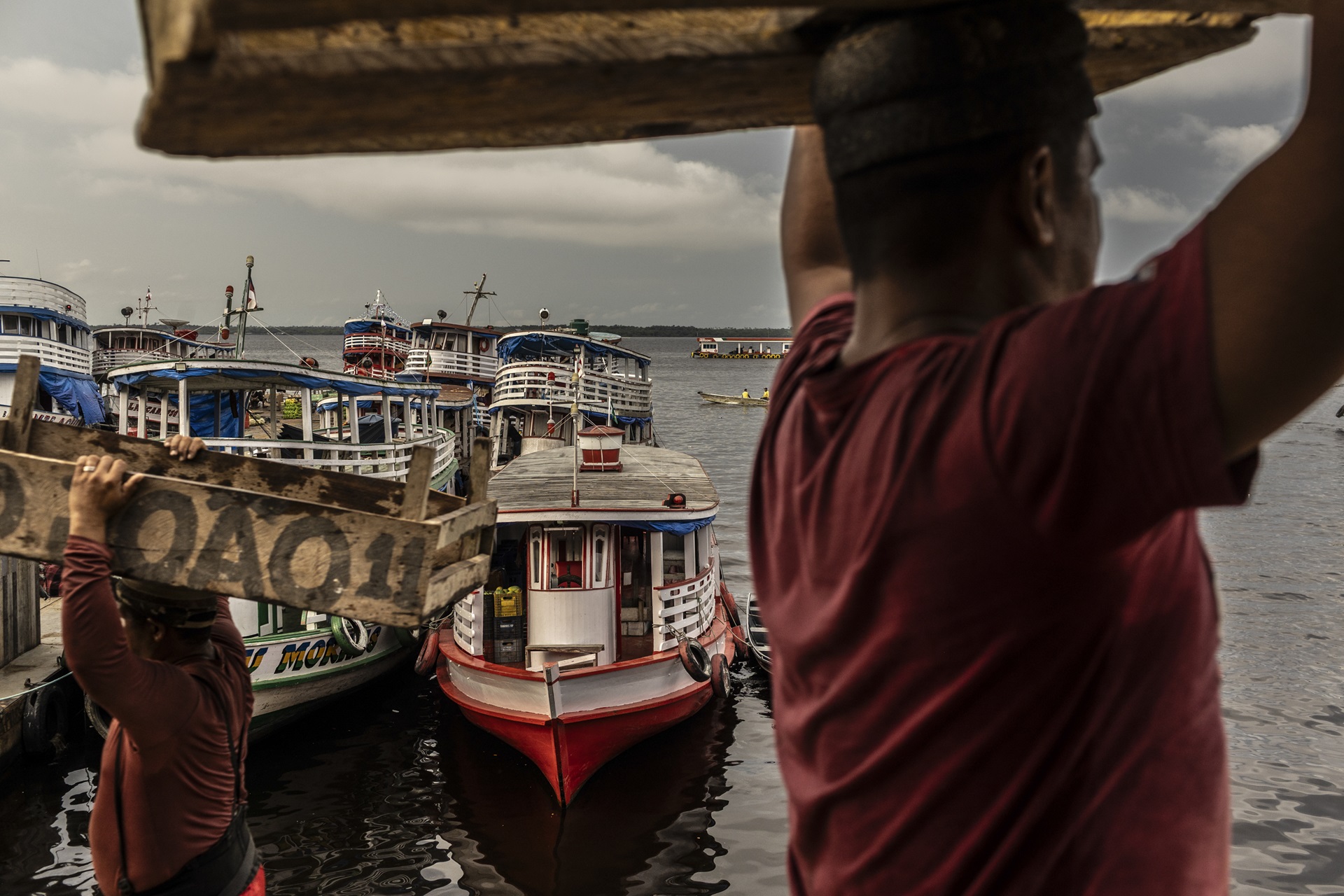 Homens transportam caixas de madeira no porto de Manaus, Brasil, em 24 de setembro de 2025. Os cais são um fluxo constante de mercadorias e pessoas, condições que os traficantes utilizam para camuflar carregamentos de drogas com destino ao leste. (Foto da Bloomberg/Dado Galdieri)Agronegócio facilita rotas fluviais