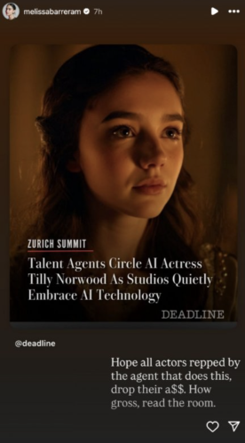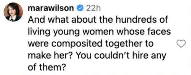 Atrizes como Melissa Barrera, Mara Wilson e Toni Collette também criticaram publicamente a novidade. “Espero que todos os atores abandonem o agente que fizer isso. Que nojo, se toquem”, escreveu Barrera. Wilson questionou: “E as centenas de jovens vivas cujos rostos foram usados para fazê-la? Vocês não poderiam contratá-la?”.