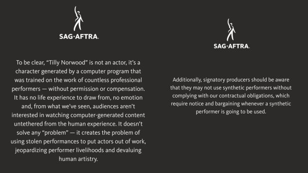 O sindicato acrescentou: “[Tilly] não tem experiências de vida para basear sua performance e não tem emoção. Pelo que vimos, o público não está interessado em assistir a conteúdos gerados por computador e sem vínculo com a experiência humana”. A organização destacou ainda que a prática ameaça os empregos de artistas reais. “Isso não resolve ‘problema’ algum — só cria um problema ao usar performances roubadas para retirar o trabalho de atores, pondo em risco o seu sustento e desvalorizando a arte humana”, completou.