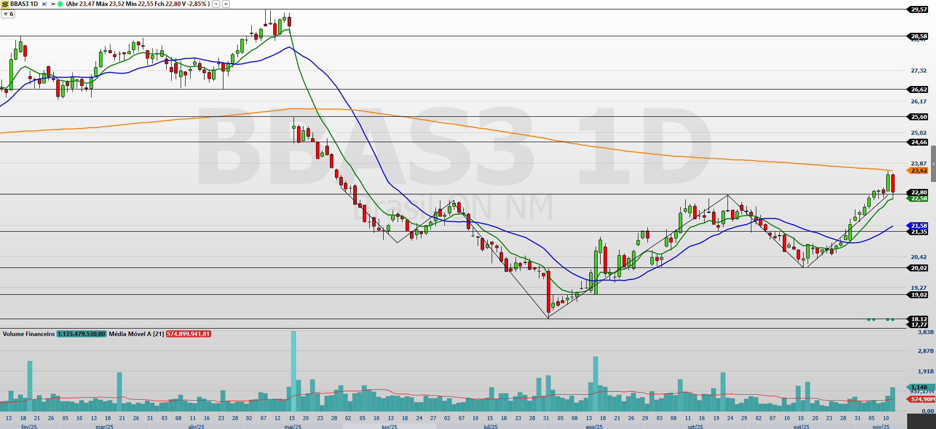 No mercado, BBAS3 reagiu com maior volatilidade: o papel caiu 2,85% na última sessão, fechando em R$ 22,80, interrompendo a trajetória de recuperação observada nas últimas semanas. Apesar disso, acumula alta de 4,11% em novembro, embora ainda registre queda de 2,20% em 2025. Com o balanço no radar e o ativo testando regiões técnicas importantes, o momento exige atenção redobrada dos investidores.