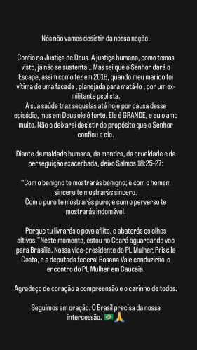 “A sua saúde traz sequelas até hoje por causa desse episódio, mas em Deus ele é forte. Ele é grande e eu o amo muito. Não o deixarei desistir do propósito que o senhor confiou a ele. Diante da maldade humana, da mentira, da crueldade e da perseguição exarcebada”, continuou.