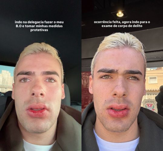 Horas depois, o influenciador disse que registraria um boletim de ocorrência. “Indo à delegacia fazer o meu B.O e tomar minhas medidas protetivas“, escreveu ele, que apareceu com um ferimento na boca. “Ocorrência feita. Agora indo para o exame de corpo de delito“, informou Caio.
