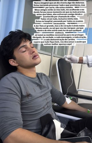“A dor física é grande, mas a do coração é ainda maior. Mesmo assim, eu sei que vou me reerguer, porque dentro de mim existe mais luz do que qualquer violência. Já tomei as medidas necessárias para me proteger. Obrigado, de verdade, a cada mensagem, a cada oração, a cada demonstração de carinho. Espero que tudo fique bem, vou descansar e assim que eu estiver melhor, apareço por aqui“, completou.