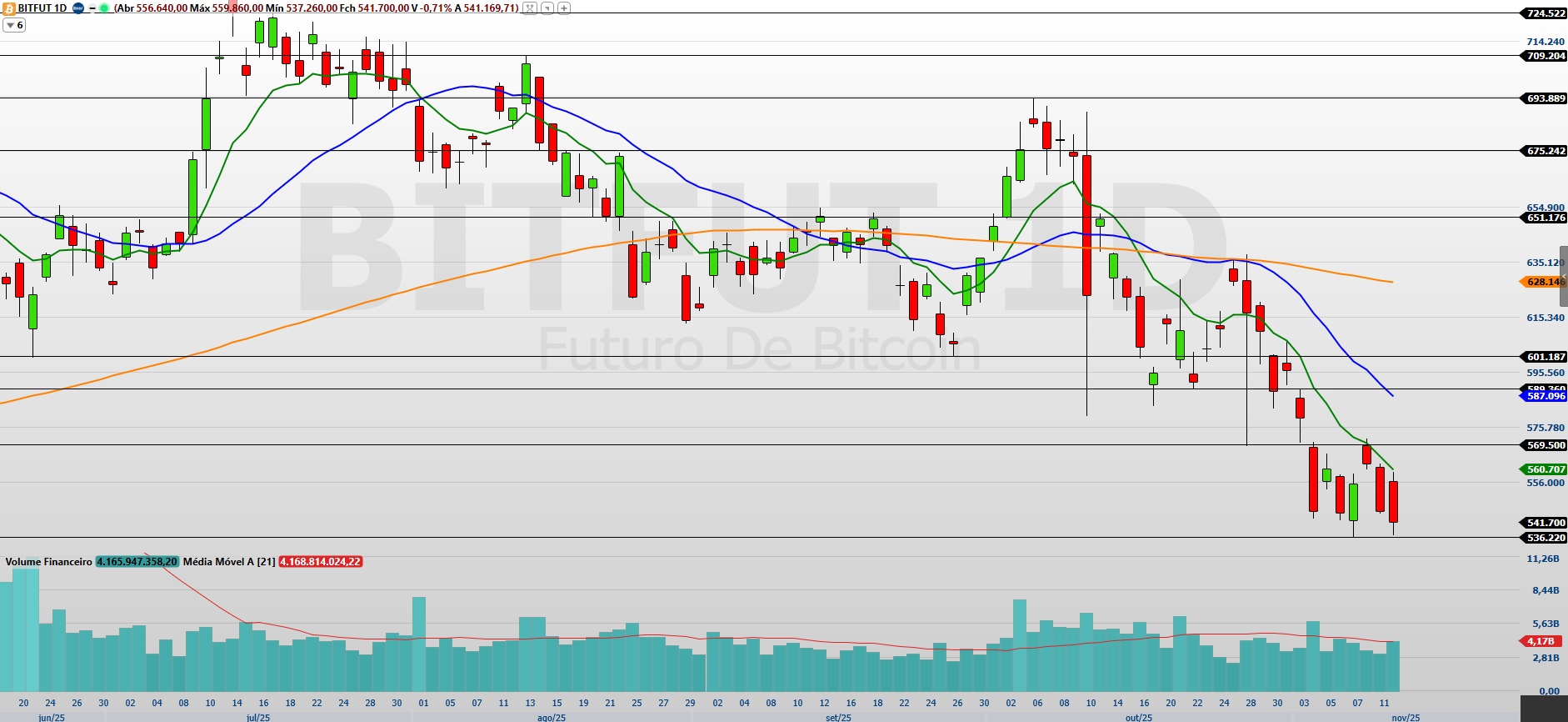 No gráfico diário, o Bitcoin futuro segue abaixo das médias móveis de 9, 21 e 200 períodos, o que reforça a predominância de um cenário técnico mais negativo. O IFR (14) está em 35,74, em zona neutra, mas já próximo da região de sobrevenda.