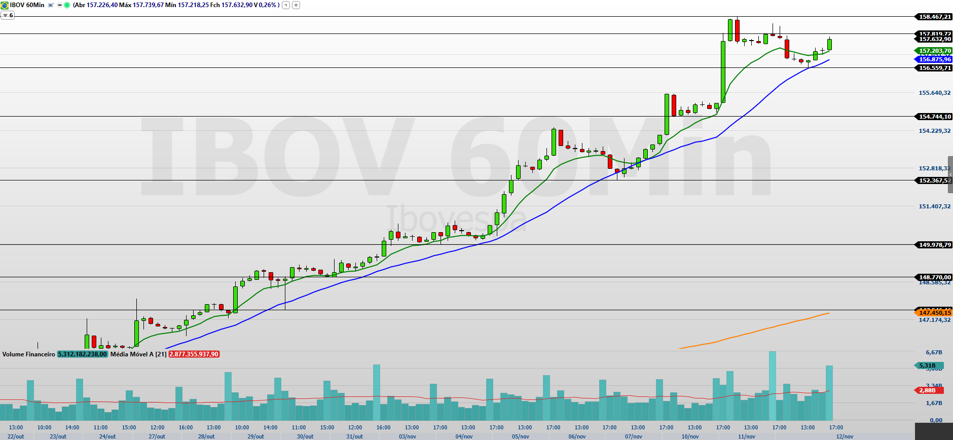 O Ibovespa encerrou a última sessão (12/11) em leve baixa, interrompendo uma impressionante sequência de 15 pregões consecutivos de valorização. O índice recuou 0,07%, aos 157.632 pontos, após oscilar entre a mínima de 156.559 pontos e a máxima de 158.133 pontos. Mesmo com o pequeno ajuste, o índice permanece próximo da máxima histórica em 158.467 pontos e segue acima da marca dos 150 mil pontos, sustentando um cenário ainda dominado pelo fluxo comprador.