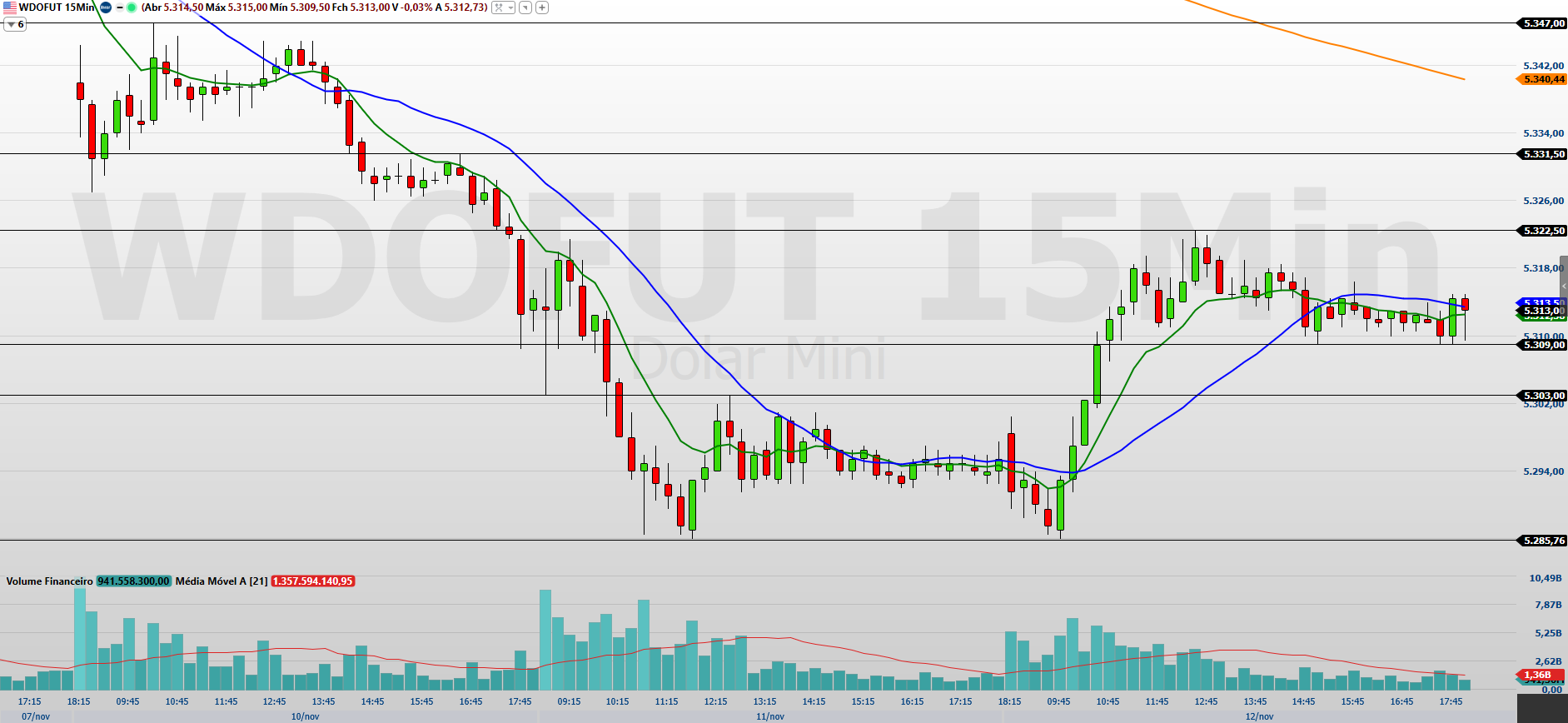 Fonte: Nelogica. Gráfico 15 minutos. Elaboração Rodrigo PazOs contratos de minidólar (WDOZ25), com vencimento em dezembro, encerraram a última sessão em alta de 0,33%, cotados a 5.313 pontos.