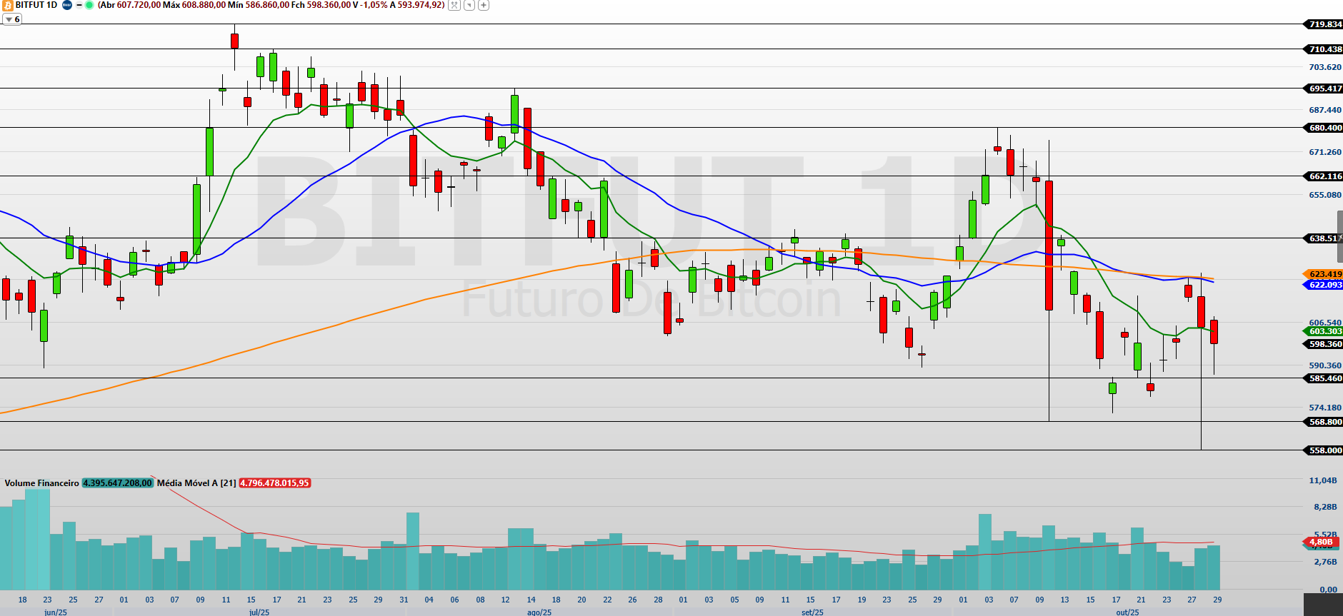 Fonte: Nelogica. Gráfico 15 minutos. Elaboração Rodrigo PazOs contratos de Bitcoin (BITV25), com vencimento em outubro, encerraram a última sessão em queda de 1,05%, cotados aos 598.360 pontos. Essa foi a segunda baixa consecutiva, refletindo a continuidade da volatilidade que tem marcado o ativo nos últimos dias e mostrando um mercado ainda sem força suficiente para retomar o viés altista.