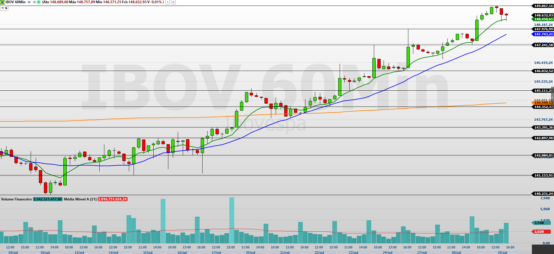 O Ibovespa encerrou a última sessão (29/10) em alta, completando a sexta valorização consecutiva e renovando sua máxima histórica. O índice avançou 0,82%, aos 148.632 pontos, após oscilar entre a mínima de 147.429 pontos e a máxima de 149.067 pontos — esta última, um novo recorde. Foi também a primeira vez que o Ibovespa encerrou o pregão acima da região dos 148 mil pontos, reforçando a força compradora que vem sustentando o movimento nas últimas semanas.