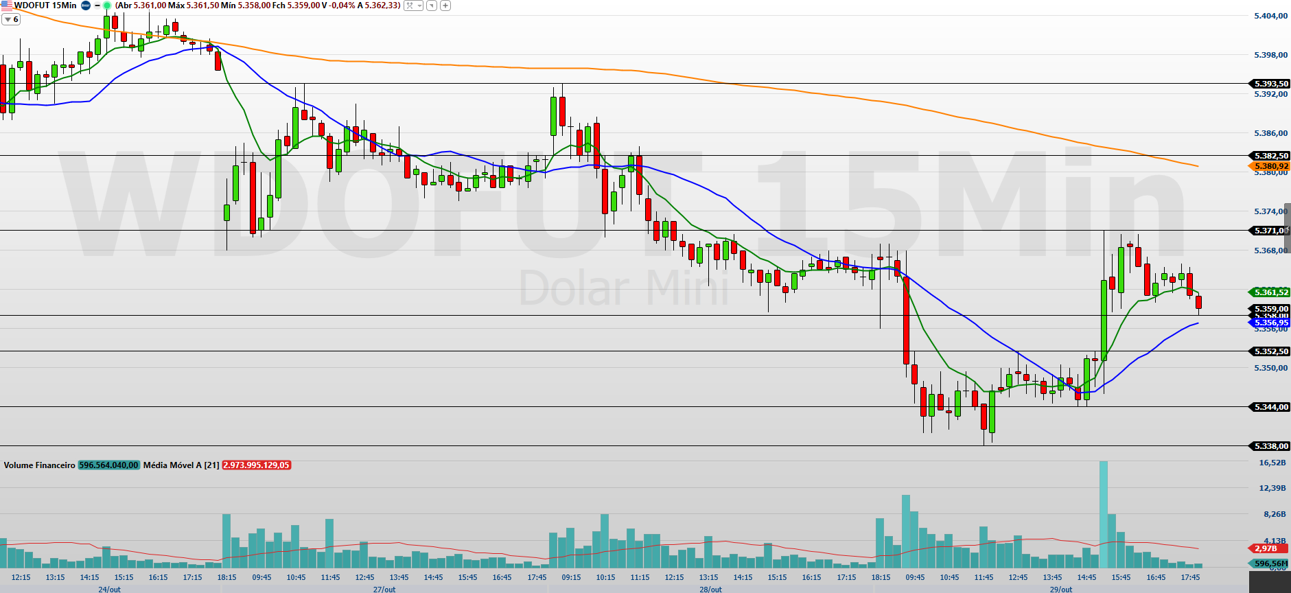 Fonte: Nelogica. Gráfico 15 minutos. Elaboração Rodrigo PazOs contratos de minidólar (WDOX25), com vencimento em novembro, encerraram a última sessão em leve baixa de 0,11%, cotados a 5.359 pontos.