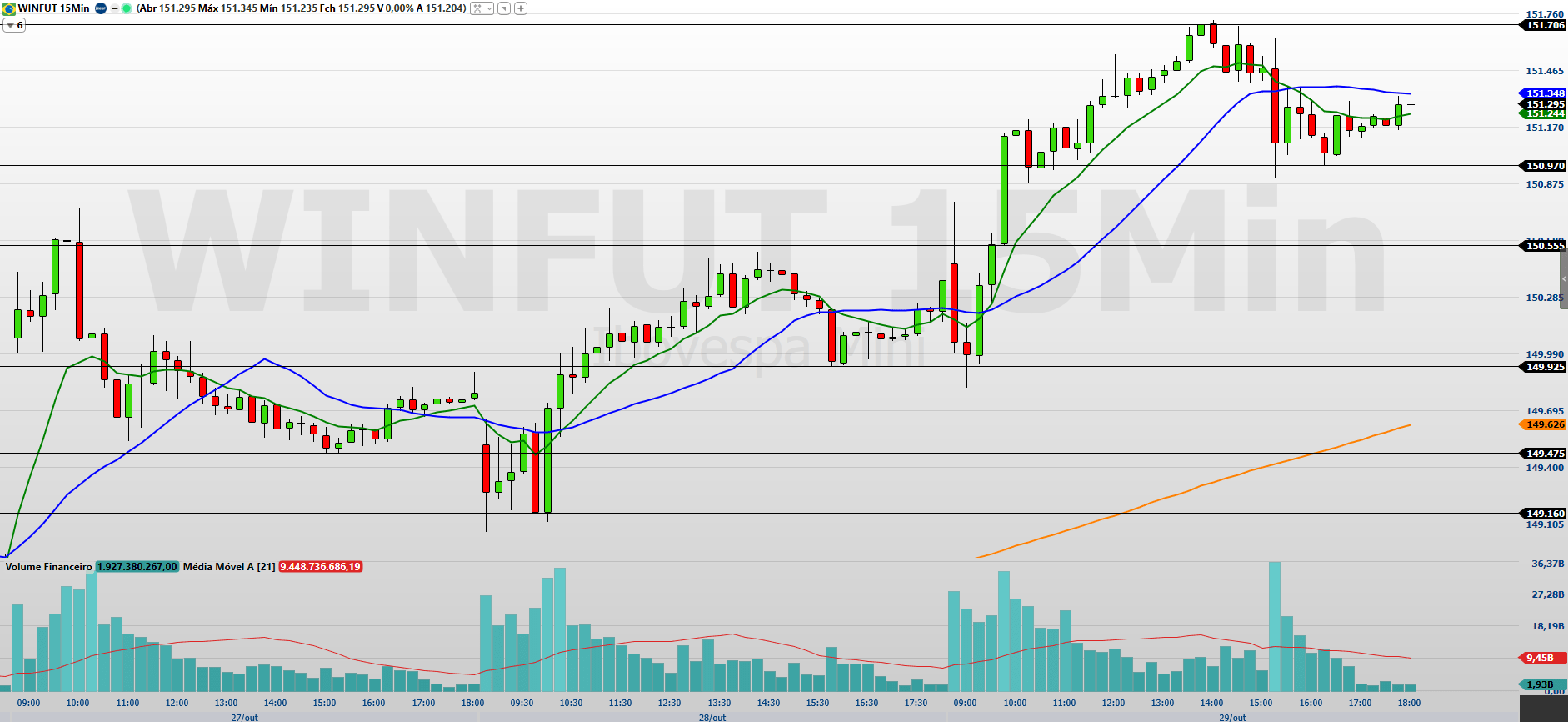 Os contratos de mini-índice (WINZ25), com vencimento em dezembro, encerraram a última sessão no positivo, registrando alta de 0,60%, aos 151.295 pontos.