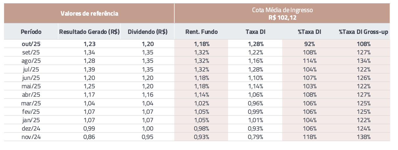 As demonstrações mostram distribuição estável ao longo dos últimos meses. Em outubro, o fundo pagou R$ 1,20, seguido de R$ 1,35 em setembro e agosto.
