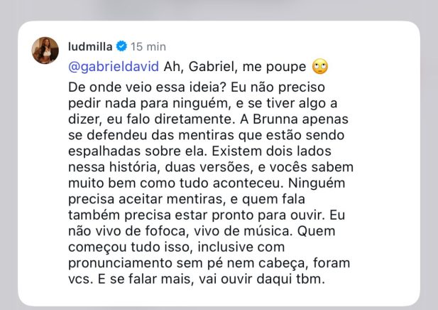Ludmilla também saiu em defesa da esposa. Segundo a cantora, em comentário no Instagram de LeoDias e em resposta a Gabriel David, Brunna apenas se manifestou sobre “mentiras” que foram ditas. Ela ainda destacou que toda história tem duas versões e deixou um recado para o empresário.