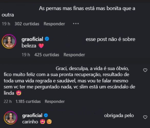 Ela também recebeu apoio do público. “É questão de tempo até igualar, apenas continue”, incentivou uma fã. “Tudo no tempo certo”, concordou Gracyanne.