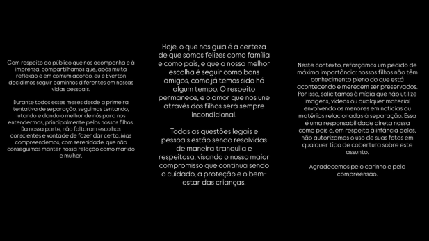 “Hoje, o que nos guia é a certeza de que somos felizes como família e como pais, e que a nossa melhor escolha é seguir como bons amigos, como já temos sido há algum tempo. O respeito permanece, e o amor que nos une através dos filhos será sempre incondicional. Todas as questões legais e pessoais estão sendo resolvidas de maneira tranquila e respeitosa, visando o nosso maior compromisso que continua sendo o cuidado, a proteção e o bem-estar das crianças”, explicou.