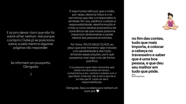 Ela ainda fez um desabafo em meio ao momento delicado. “É importante reforçar que a mídia, por vezes, distorce fatos e cria narrativas que não correspondem à verdade. Por isso, pedimos cuidado e responsabilidade. Desinformação é crime e, como adultos, precisamos ter consciência de que nossas palavras impactam diretamente a saúde mental das pessoas envolvidas. Por favor, pelos meus filhos, eu peço que este momento seja tratado com sensibilidade e discrição, evitando especulações, para que possamos viver esse ciclo de forma pacífica”, desejou.