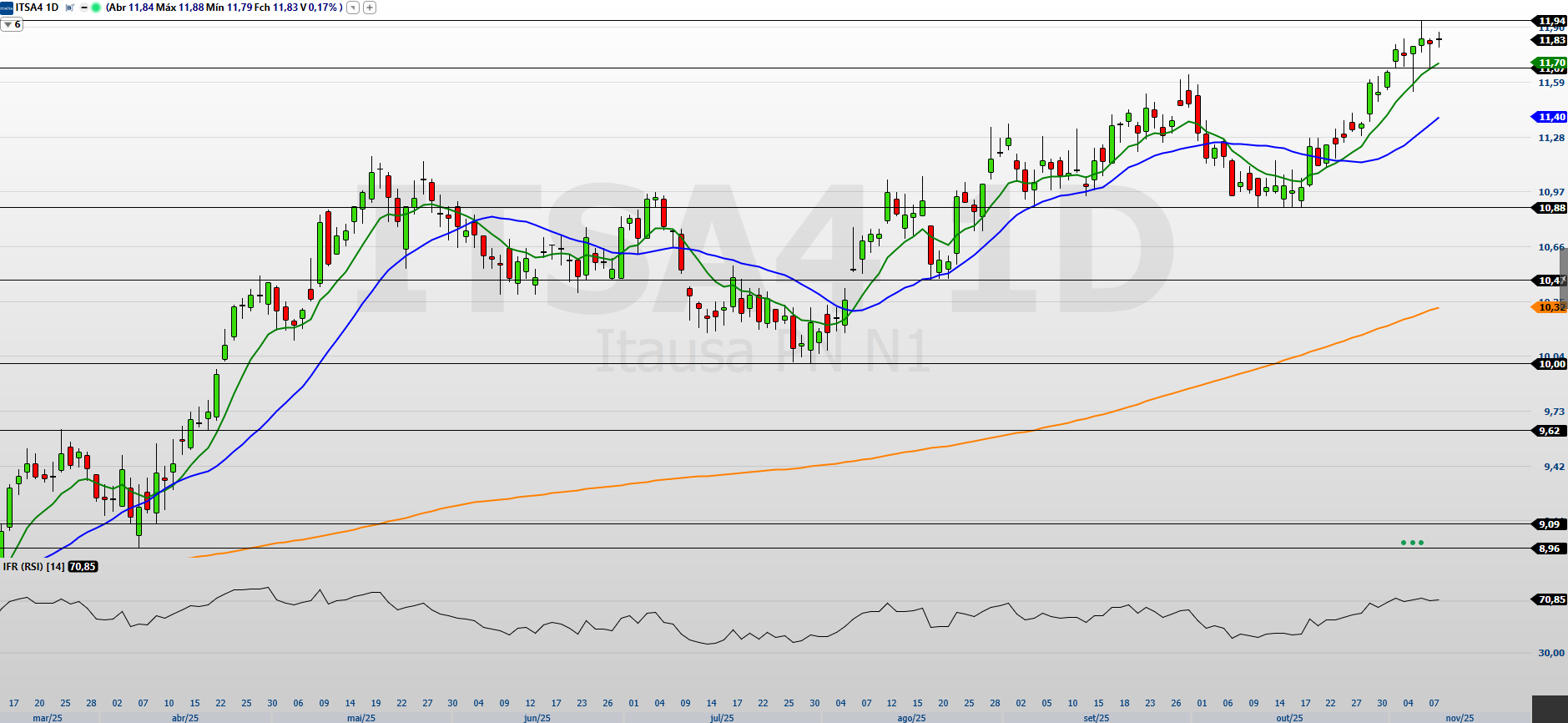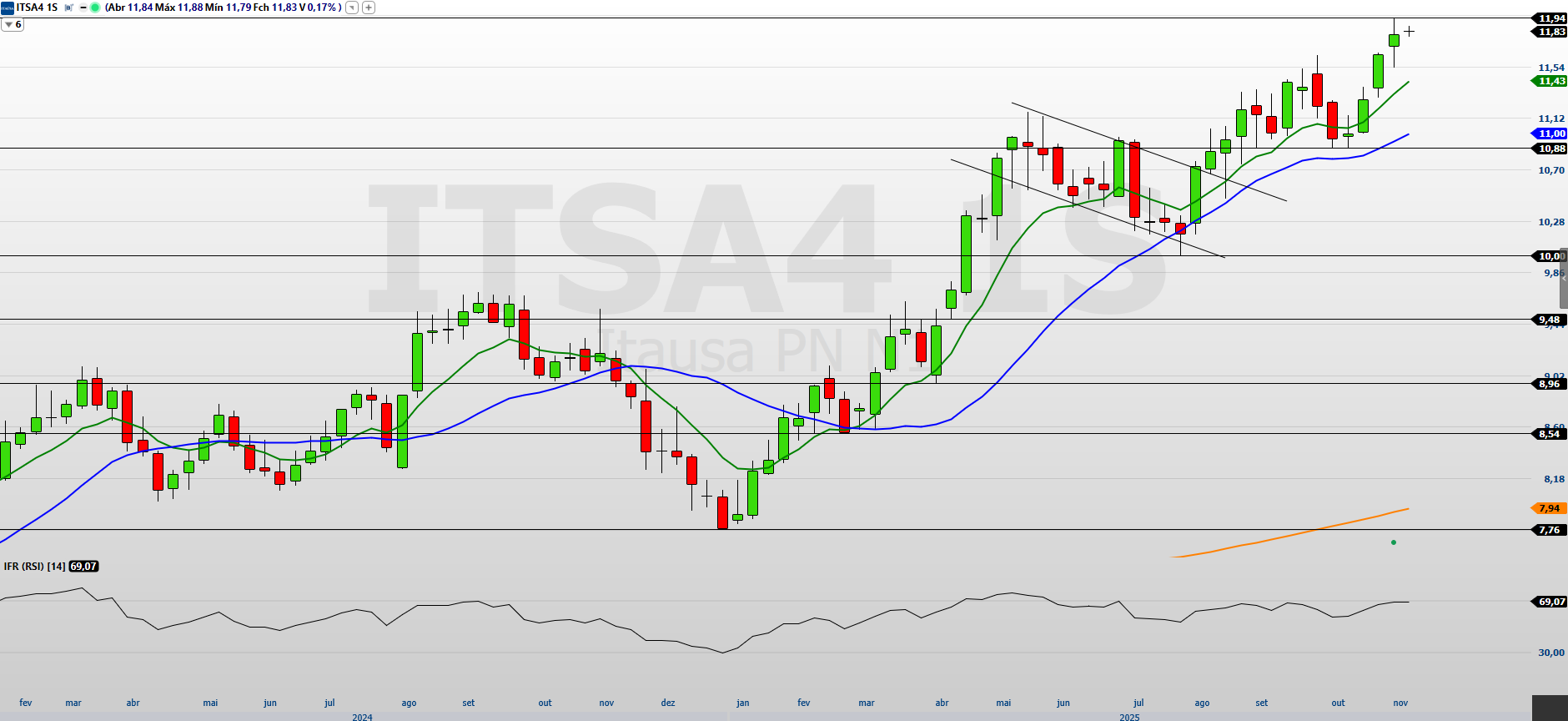 No mercado, Itaúsa segue como destaque na B3, mantendo tendência de alta tanto no curto quanto no médio prazo. No acumulado de 2025, o papel avança 47,02%, enquanto em novembro sobe 1,55%, sustentada pelo fluxo comprador que levou o ativo a renovar máxima histórica em R$ 11,94. Apesar do sinal de possível acomodação, a leitura técnica permanece positiva, desde que sejam respeitados os principais níveis de suporte.