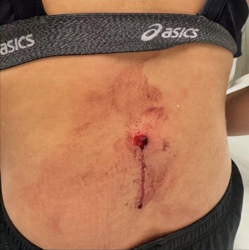 Região do corpo em que a jogadora foi atingida pelo tiro. (Foto: Reprodução/Redes Sociais)Apesar do susto, Júlia se recupera em casa, evitando movimentos bruscos e com dores na região do quadril. A previsão é que retorne aos treinos em cerca de um mês, com a esperança de jogar no último duelo do Tijuca na Superliga deste ano, contra o Praia Clube, no dia 22 de dezembro.