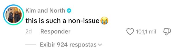 Comentário feito por Kim em uma conta que ela compartilha com a filha. (Foto: Reprodução/TikTok)O novo visual de North gerou muitos comentários negativos na web. No entanto, vários fãs também saíram em defesa da menina e apontaram que poderia ser uma fantasia de Halloween. “Ainda bem que as redes sociais não existiam quando eu estava passando pela minha fase adolescente de autodescoberta. A internet enlouqueceu”, comentou um internauta. Outro ironizou: “Grande notícia para pessoas desempregadas e sem filhos: North West está passando por uma fase pré-adolescente”.
