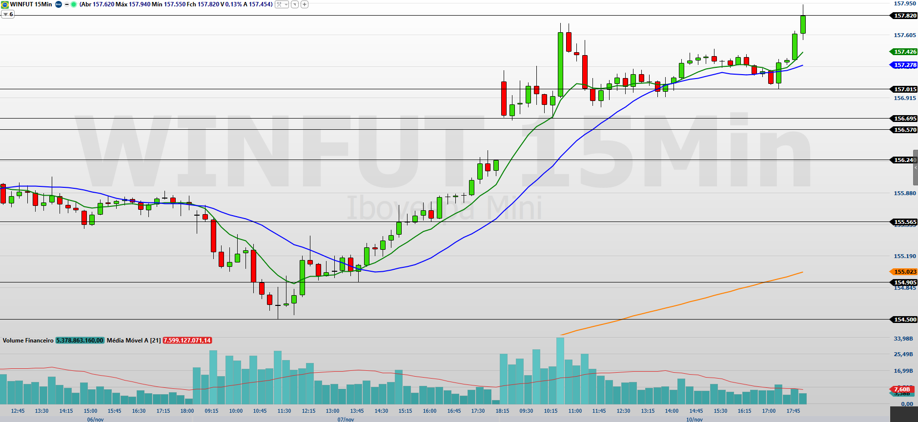 Os contratos de mini-índice (WINZ25), com vencimento em dezembro, encerraram a última sessão (10/11) em terreno positivo, registrando alta de 1,05%, aos 157.820 pontos. Já o Ibovespa registrou mais um dia de recordes, subindo 0,77% e alcançando os 155.257 pontos, na 14ª alta consecutiva — o maior rali desde 1994. O otimismo veio da expectativa de fim da paralisação do governo dos EUA, que impulsionou os mercados globais, com Nova York e Europa em alta. No Brasil, o cenário interno também contribuiu, com declarações do ministro Fernando Haddad sobre espaço para cortes na Selic, além da continuidade da temporada de balanços e do avanço de Petrobras (PETR3; PETR4), Vale (VALE3) e bancos, que sustentaram o índice.
