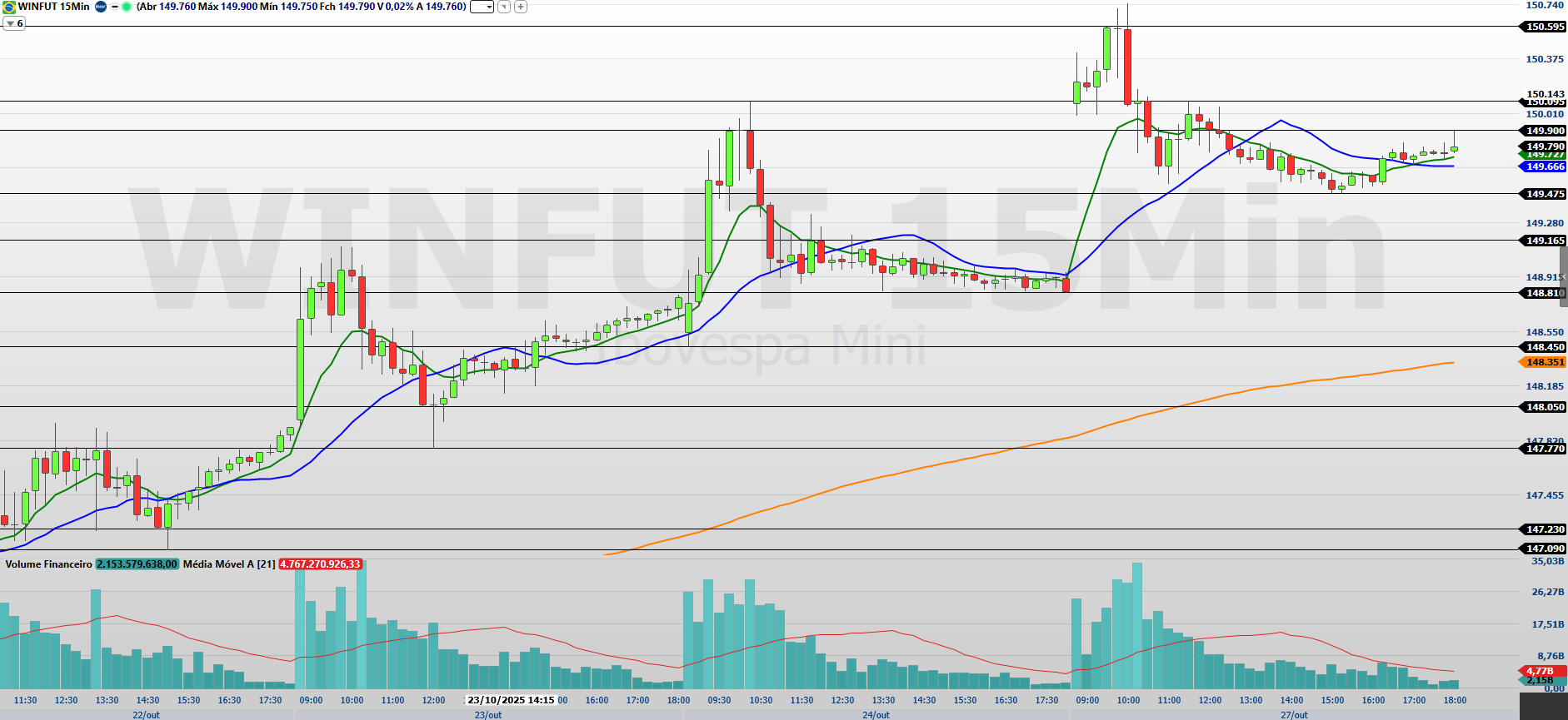 Pelo gráfico de 15 minutos, observa-se que o mini-índice manteve o ritmo comprador, negociando acima das médias de 9 e 21 períodos, com estrutura favorável à continuidade da alta. Para seguir ganhando força, será necessário romper a resistência em 149.900/150.095 pontos, mirando as próximas faixas em 150.595/150.850 e 151.255/151.700 pontos.