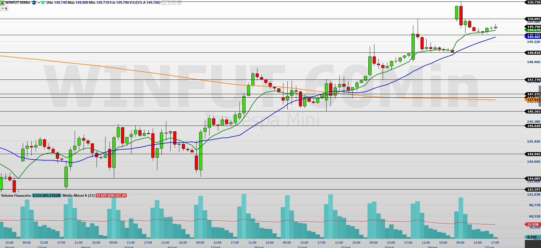 No gráfico de 60 minutos, o mini-índice também encerrou em alta, mantendo-se acima das médias de 9 e 21 períodos, o que reforça o cenário técnico construtivo.