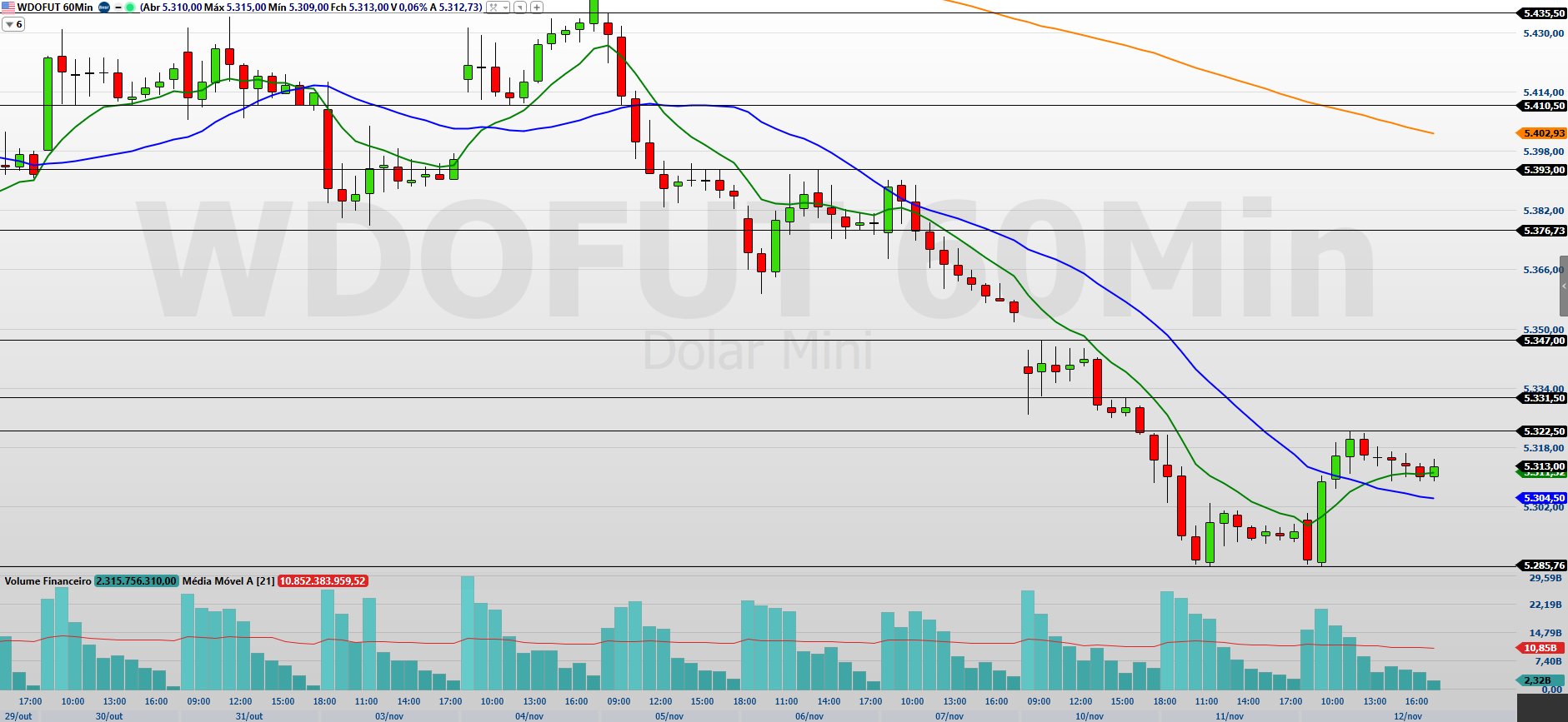 No gráfico de 60 minutos, o cenário mostra uma leve melhora, com o minidólar voltando a operar acima das médias móveis de 9 e 21 períodos, após o repique da última sessão.