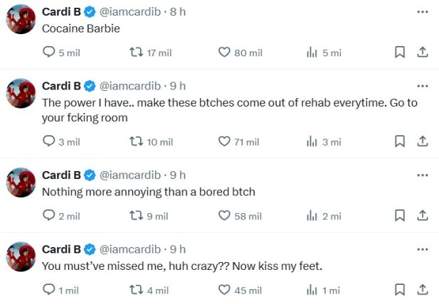 Cardi reagiu às publicações na madrugada desta terça-feira (30), e todas as respostas continuam em seu perfil. A artista fez insinuações sobre abuso de drogas por Minaj. “Você sentiu minha falta, né, maluca? Agora beije os meus pés. Nada mais irritante do que uma v*dia entediada. O poder que eu tenho faz essas v*dias saírem da rehab toda vez. Vá para a p*rra do seu quarto. Barbie da cocaína”, disparou.