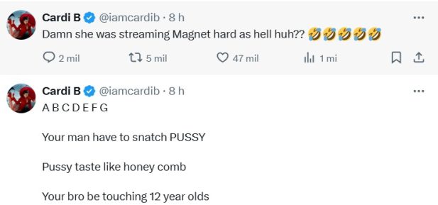Em outros tuítes, Nicki se aproveitou da letra de “Magnet”, do novo álbum de Cardi, para atacá-la. Em um trecho da versão original, a rapper entoa: “ABCDEFG, essas vadias não podem me f*der”.