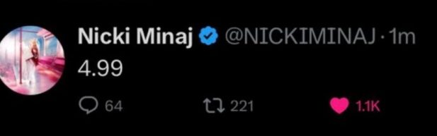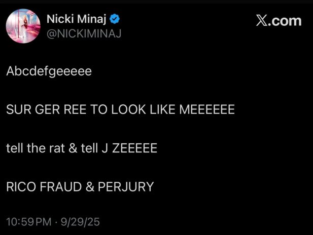 Minaj, por sua vez, mudou para: “Abcdefgeeeeeeee. Cirurgia para se parecer comigo. Diga ao rato e diga ao Jay Z. Rico, fraude e perjúrio”.