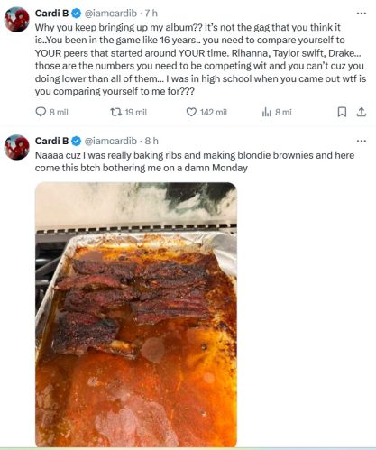 Em outros tuítes, Cardi B revelou como foi pega de surpresa pelas alfinetadas e respondeu à altura. “Eu estava assando costelas e fazendo brownies, e aí vem essa v*dia me incomodando numa maldita segunda-feira”, escreveu, compartilhando uma foto do prato.
