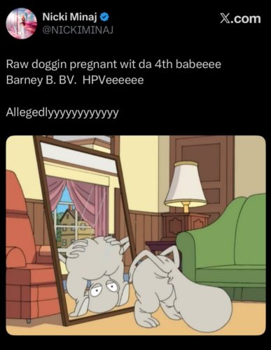 A rapper ainda ironizou que a rival já esteja indo para o quarto filho, e que não fosse adepta dos métodos contraconceptivos. Minaj também sugeriu que Cardi tivesse infecções sexualmente transmissíveis. “Fodendo no pelo. Grávida do quarto bebê. Barney B tem HPV. Supostamente“, soltou.