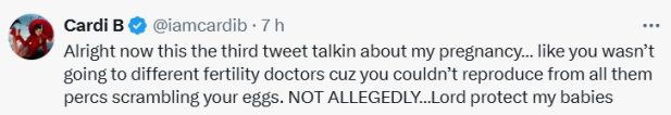 Por fim, Cardi rebateu Nicki sobre as publicações que mencionavam sua gravidez. “Muito bem, este é o terceiro tuíte que você fala sobre a minha gravidez. Como se você não tivesse consultado vários médicos especialistas em fertilidade, porque não conseguia engravidar devido a todas aquelas drogas que alteravam os seus óvulos. Não supostamente! Senhor, proteja os meus bebés”, finalizou.