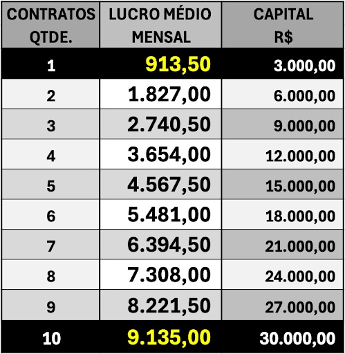 - Meta avançada: até R$ 9.000 mensais, com capital mais robusto.