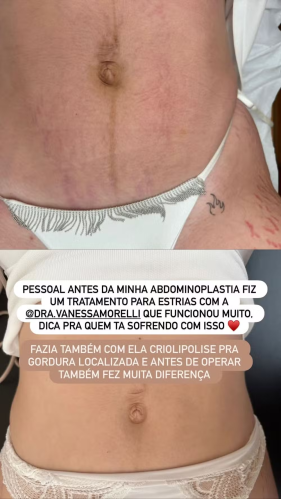 A influenciadora também relembrou um período deliciado que passou com a autoestima: “Já me vi no ápice de me sentir feia, teve um momento em que eu estava com 30kg a mais do que o peso saudável para mim. Além disso, estava cheia de celulite, pele flácida, estrias e com áreas escuras que me incomodavam muito. Não precisava ninguém me falar, porque eu já não me sentia bonita”.