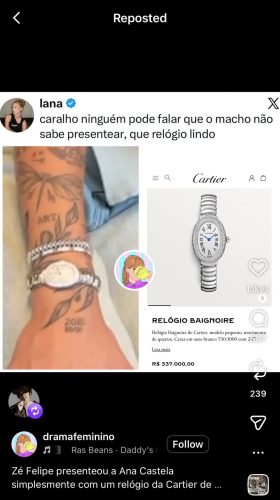 Em um reels repostado por Ana, a cantora deu a entender que foi surpreendida com um item para lá de luxuoso: um relógio Cartier Baignoire.